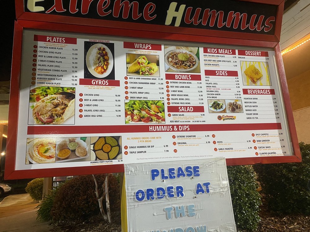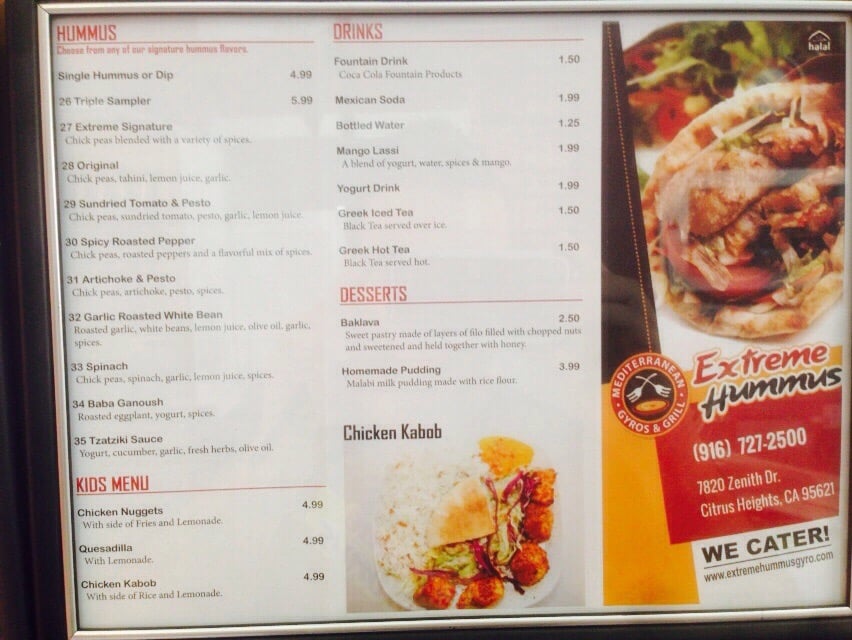 Introducing Extreme Hummus, a Mediterranean gem located in Citrus Heights, CA. Known for its diverse menu offering vegan and vegetarian options, Extreme Hummus also caters to special dietary needs with plastic-free packaging. This restaurant provides an inclusive environment with gender-neutral restrooms and wheelchair accessibility, making it a welcoming spot for all. Customers rave about the flavorful hummus options, with favorites like jalapeƱo cilantro and traditional varieties. The Birria Tacos, not even on the menu, show the chef's willingness to accommodate special requests. The spacious, clean ambiance is perfect for both small and large groups, ensuring a comfortable dining experience. Extreme Hummus is a must-visit for those craving Mediterranean cuisine with a twist.
